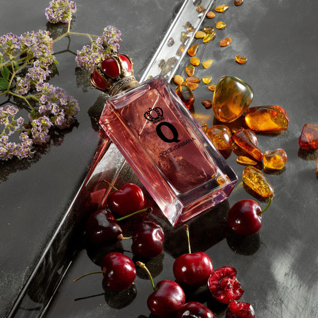 La salida brilla con limón siciliano y naranja chispeante, como un destello fresco que se abre paso. Después aparece la cereza negra, mucho más profunda y dulce que la del Q original, envuelta por un heliotropo cremoso que le da un aire sofisticado. Finalmente, el ámbar y las notas amaderadas dejan un fondo cálido y sensual, como una caricia duradera en la piel.